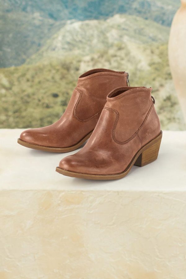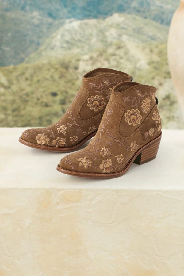 These Western-inspired leather booties are crafted from ultra-soft Italian leather and features back zippers with ring pulls, soft cushioned footbeds and arch supports for extra comfort. Choose from solid leather or floral embroidered suede. 2″ stacked heels.
