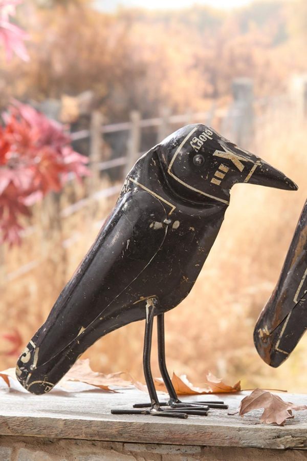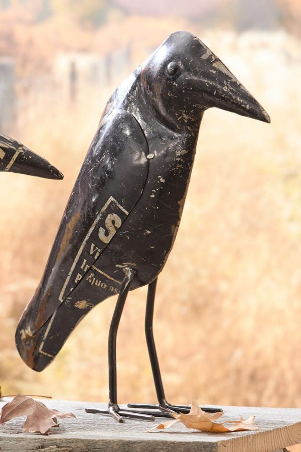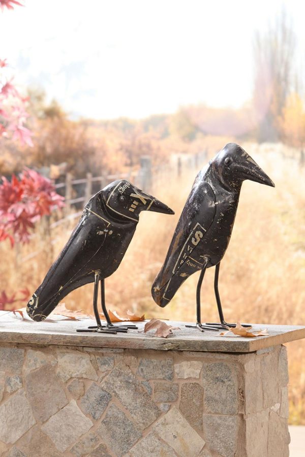 Handcrafted crow decor is made from recycled iron featuring an antique finish. Set of two. Indoor or sheltered outdoor use only.