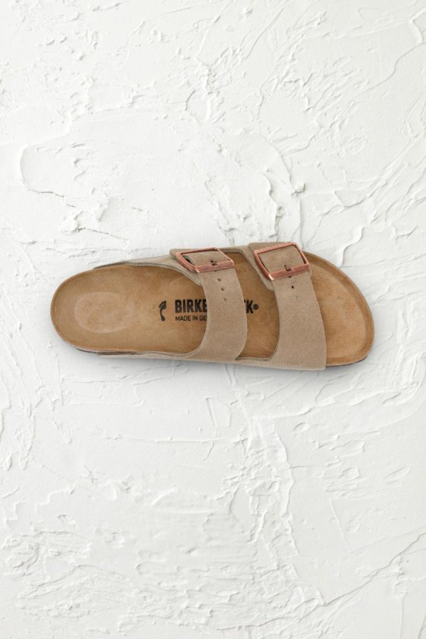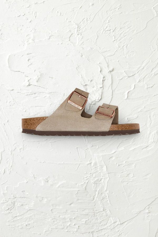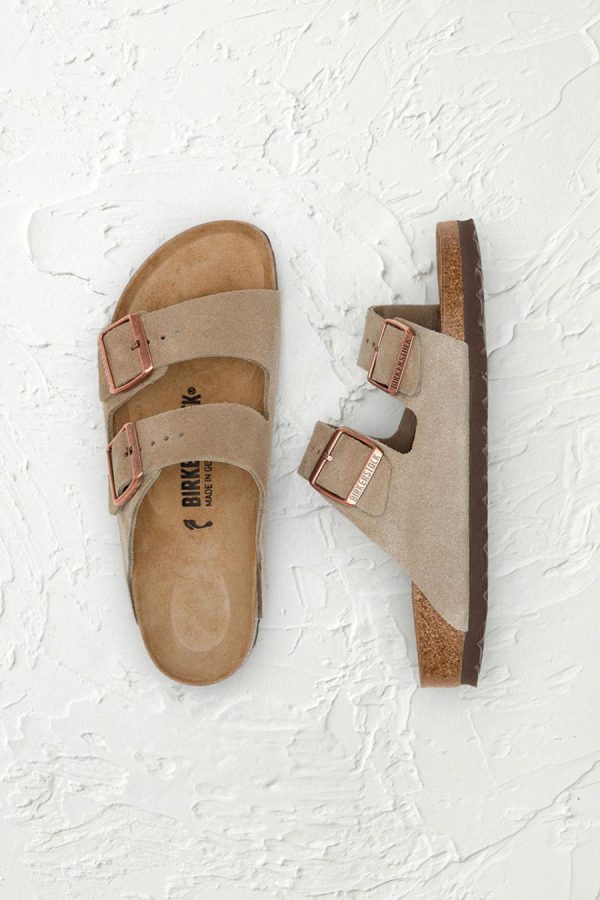 The legendary Arizona Sandals by Birkenstock combine time-honored German craftsmanship with exceptional comfort. These iconic classics feature premium suede uppers with dual adjustable buckle straps. Raised toe bars and deep heel cups provide anatomical comfort, while contoured cork/latex footbeds and arch supports conform to the foot, creating custom support with wear. Suede lined. 1″ platforms with flexible, lightweight EVA soles.