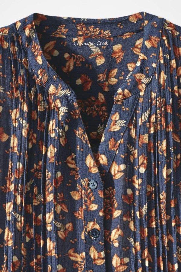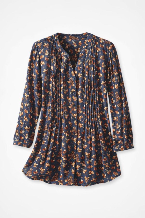 This woven tunic features an autumn leaf-and-acorn print with flattering pintuck details that add dimension, shaping and ease to the top. This flattering silhouette has a full button front, 3/4 button-cuff sleeves, pintuck front and back yoke, and shirttail hem.