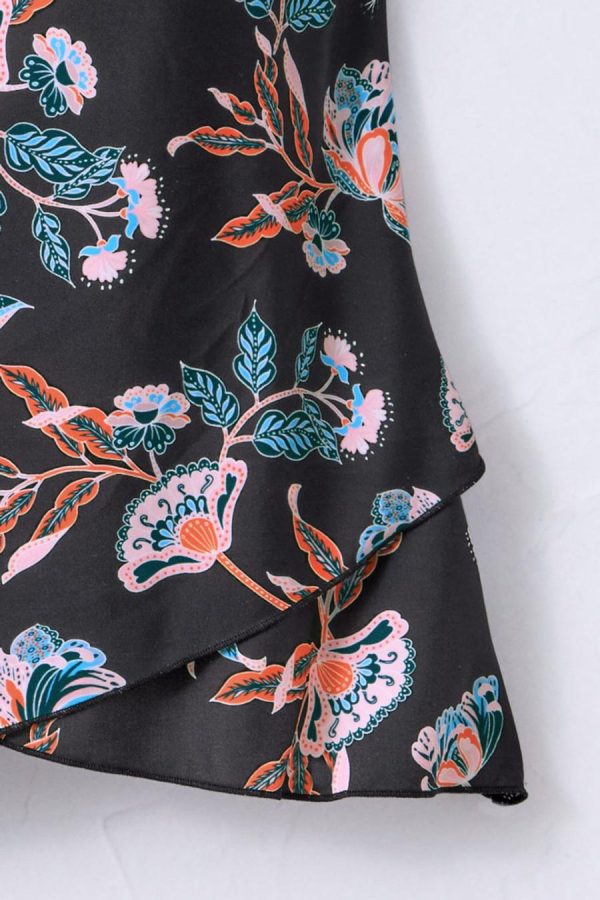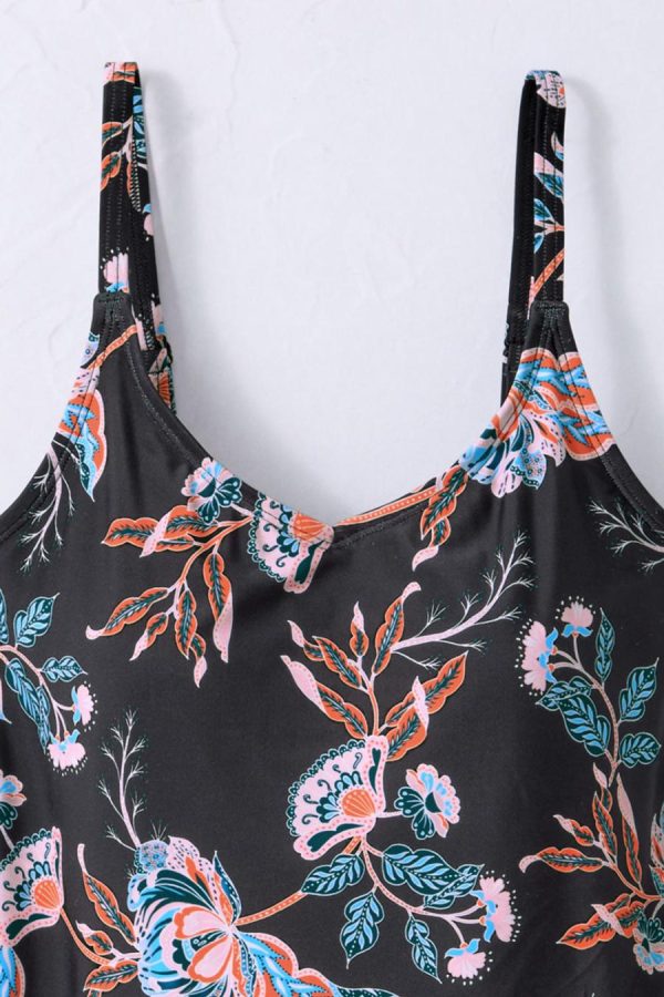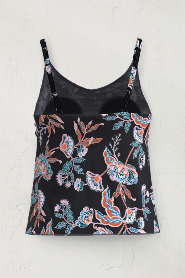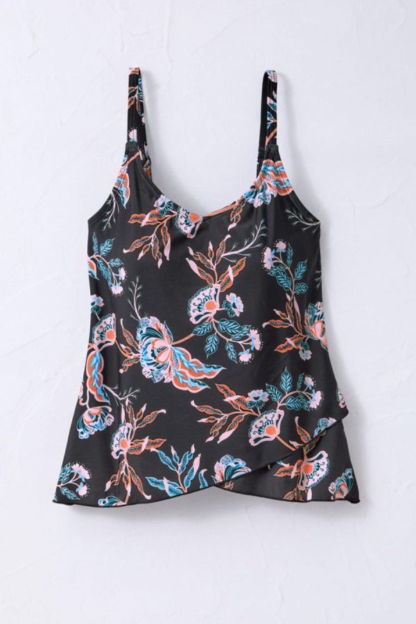 Lush floral artistry, in a graceful new silhouette. Overlapping front tulip hem drapes easily, with slight ruching at the bust. Adjustable straps, shelf bra with fixed cups, straight back. With UPF 30 for UV protection, and chlorine resistant.