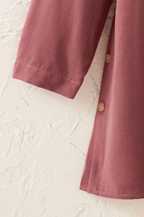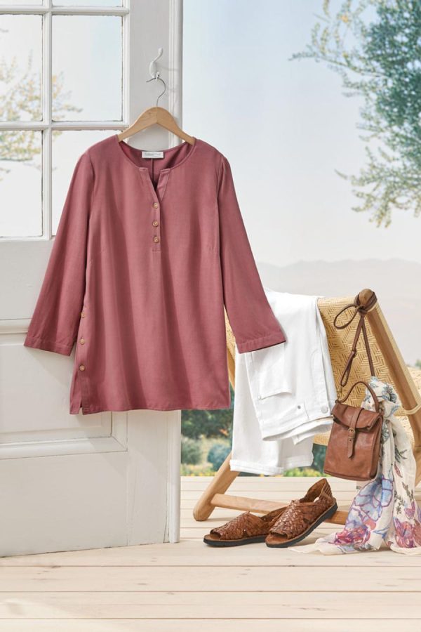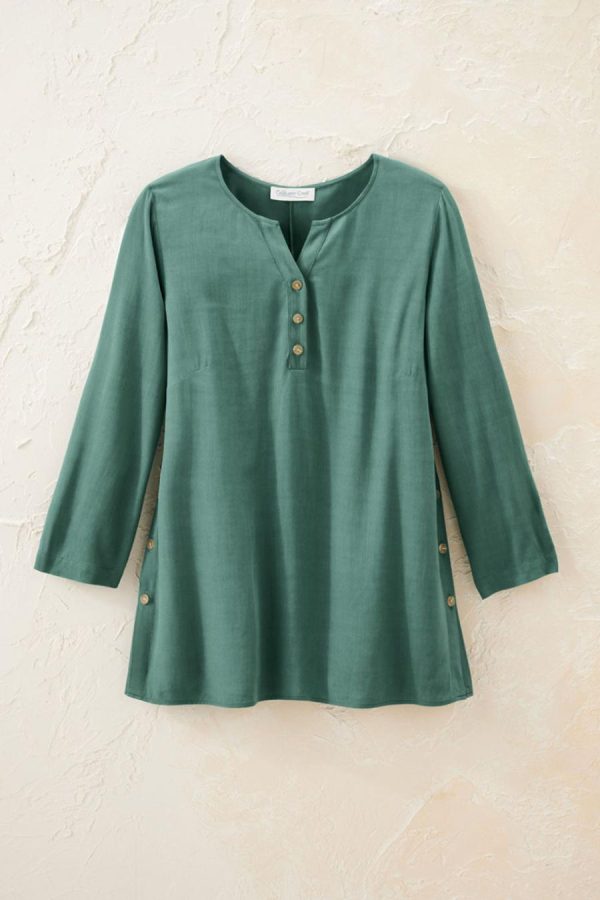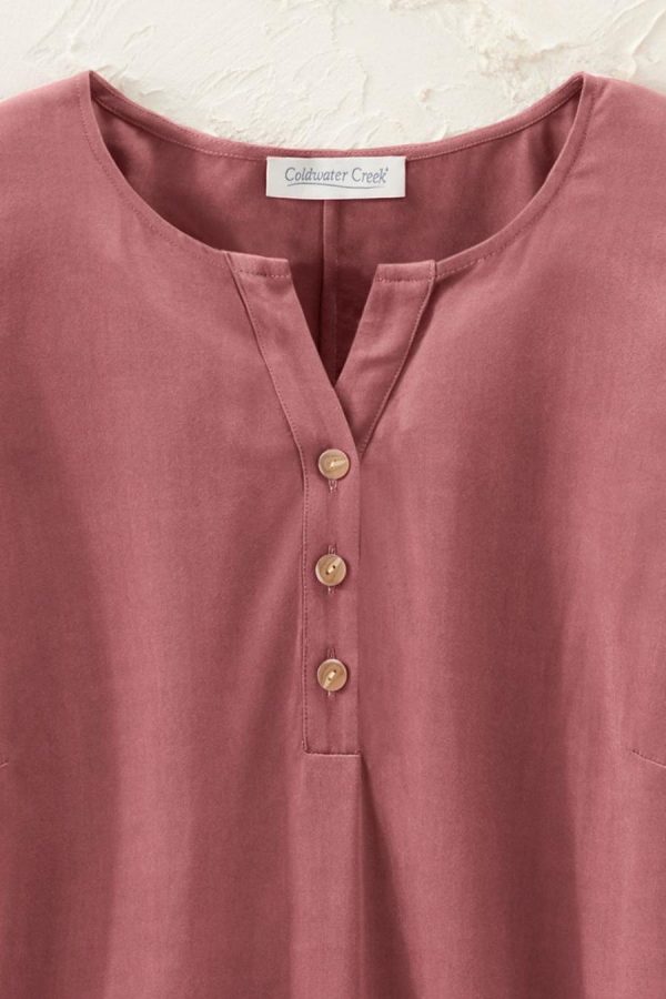 A favorite style, in a fresh silhouette. Loved for its softness, beautiful drape and casual versatility, our bistro fabric is light yet structured, comfortable and flattering. Henley-style split neck has partial button placket, and functional buttons at the sides can be opened to create side slits. Straight hem.