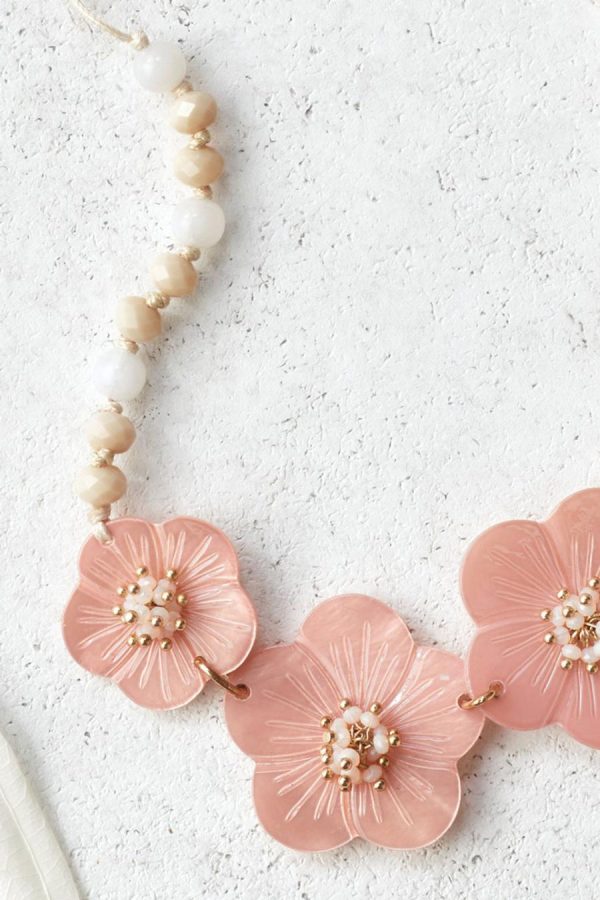 Luminous mother-of-pearl blossoms catch light on this handmade necklace, beautifully detailed with beaded centers and complemented by a strand of polished beads.