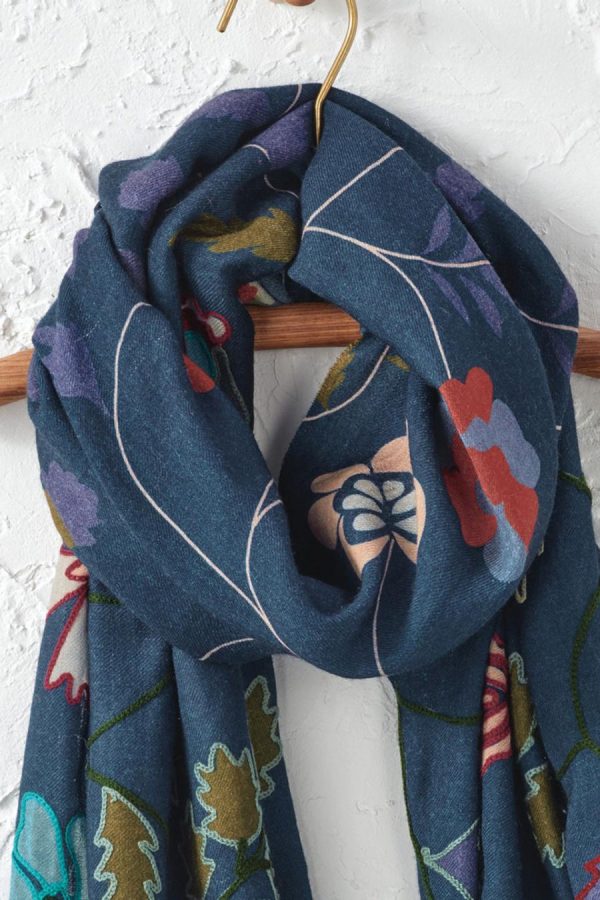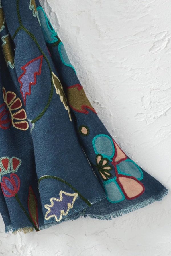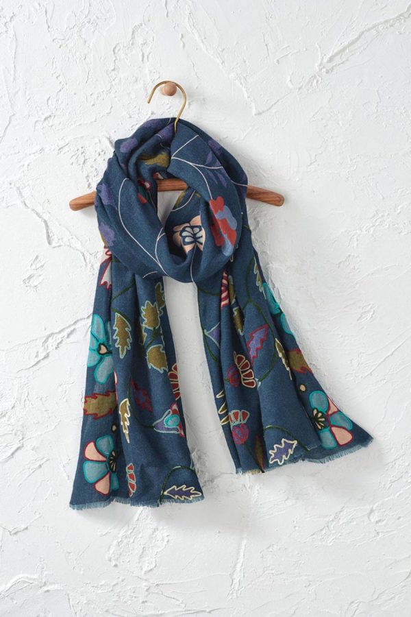 A whimsical wool scarf features an array of botanicals beautifully traced with intricate embroidery in vibrant hues. This artful midweight piece drapes gracefully and adds rich texture to any ensemble throughout the seasons. The generous proportions and fringed edges create effortless sophistication. Perfect for casual looks or complementing tailored pieces. 76″ x 28″ with raw-edge fringe.