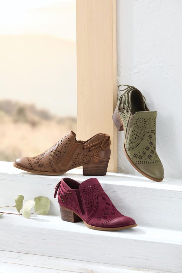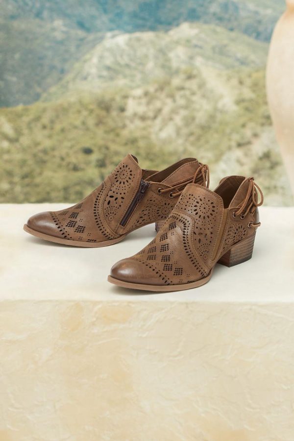 Natural nubuck leather ankle booties combine sophisticated style with practical details. Intricate laser cutouts create visual interest while decorative back ties and convenient inside zippers enhance both form and function. Handmade, with leather linings, cushioned footbeds and burnished toes. 1½” stacked heels. Faux rubber traction soles.