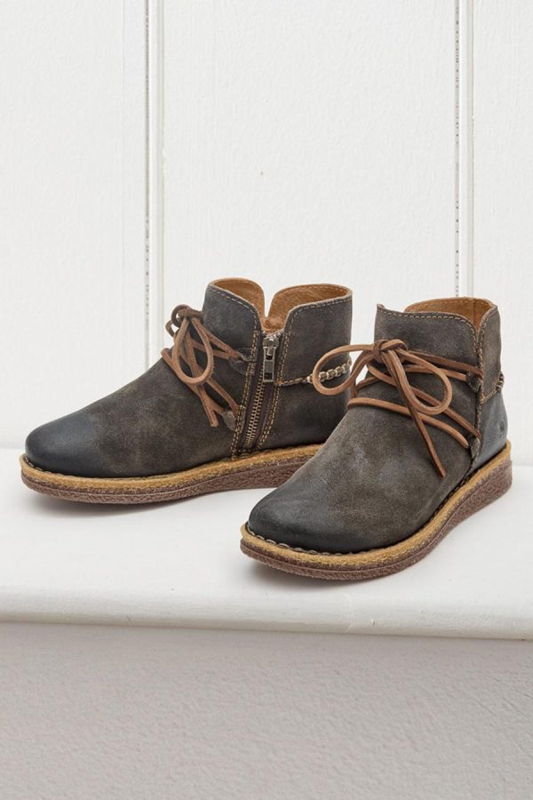 Naturally comfortable booties with Børn’s signature quality. Soft, hand-finished distressed leather uppers with inner zip, cork-infused midsoles and removable cushioned footbeds.