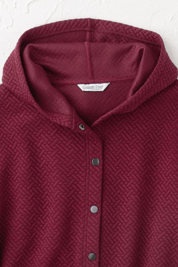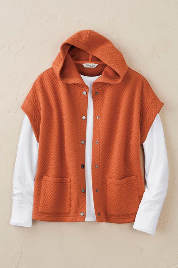 Refresh your layered look with this fun new vest, ideal for a little extra warmth. Soft, snap-front style is quilted all over, with a hood, roomy dolman cap sleeves and patch pockets. Side-slit hem.
