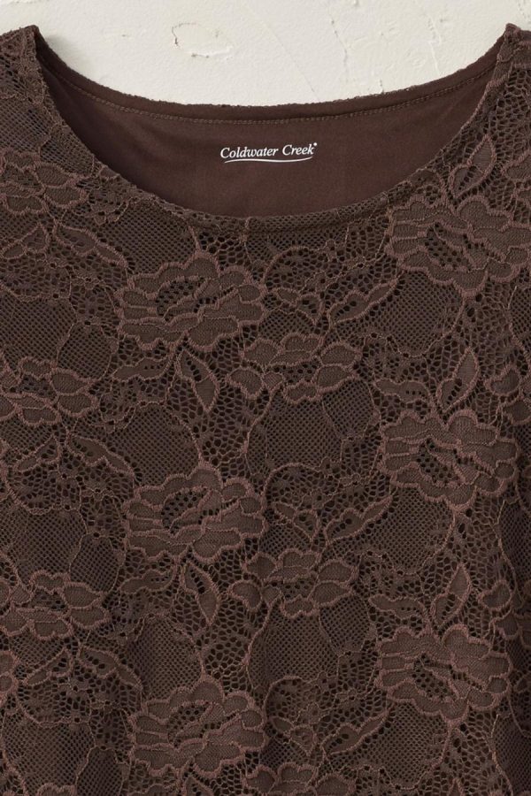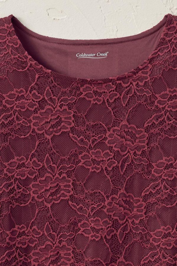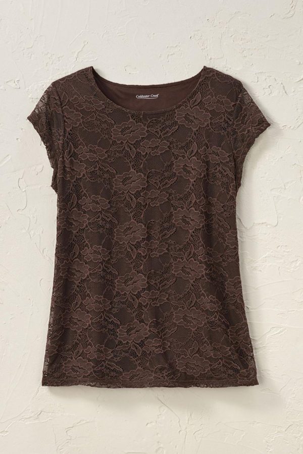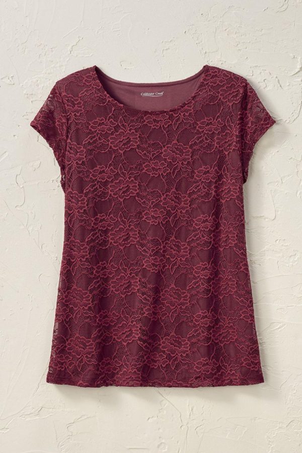 Dress up any look with this stretch lace tee – and enjoy a comfortable fit, too. Midweight style features a lace overlay, with a knit body lining and sheer cap sleeves.