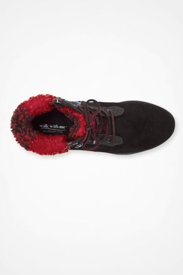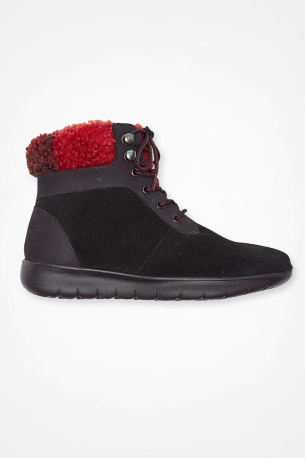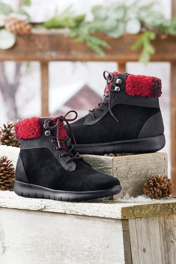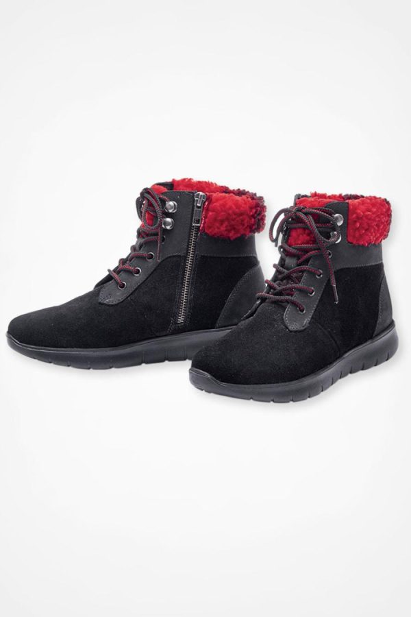 Cozy, sporty, comfortable. These suede booties have snug sherpa fleece collars, with both lace-up and inner zip closures.