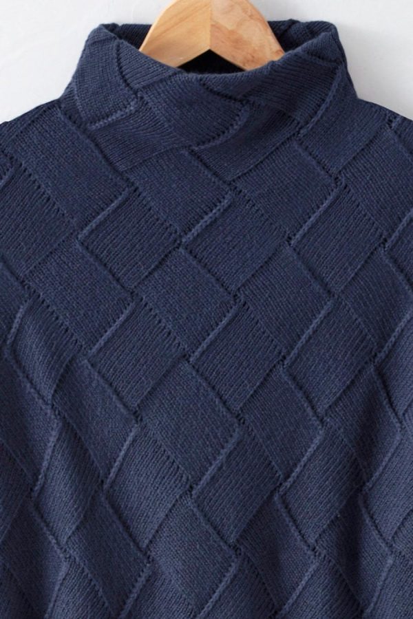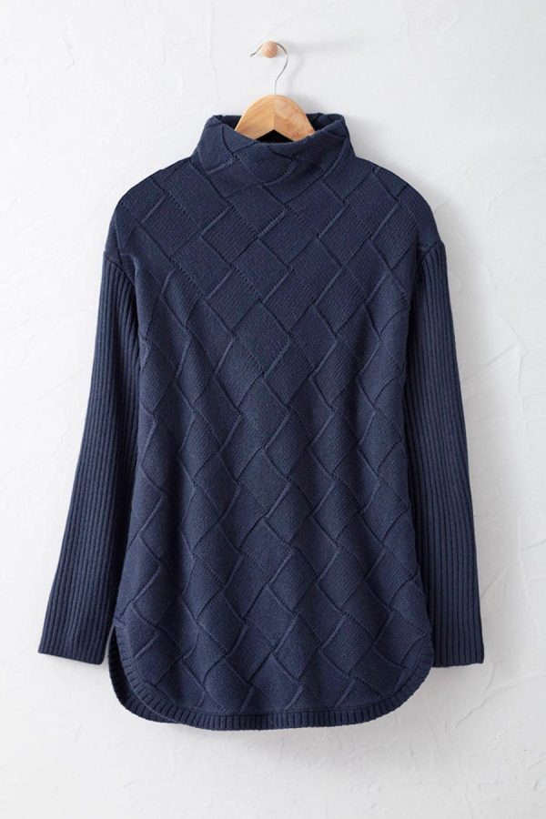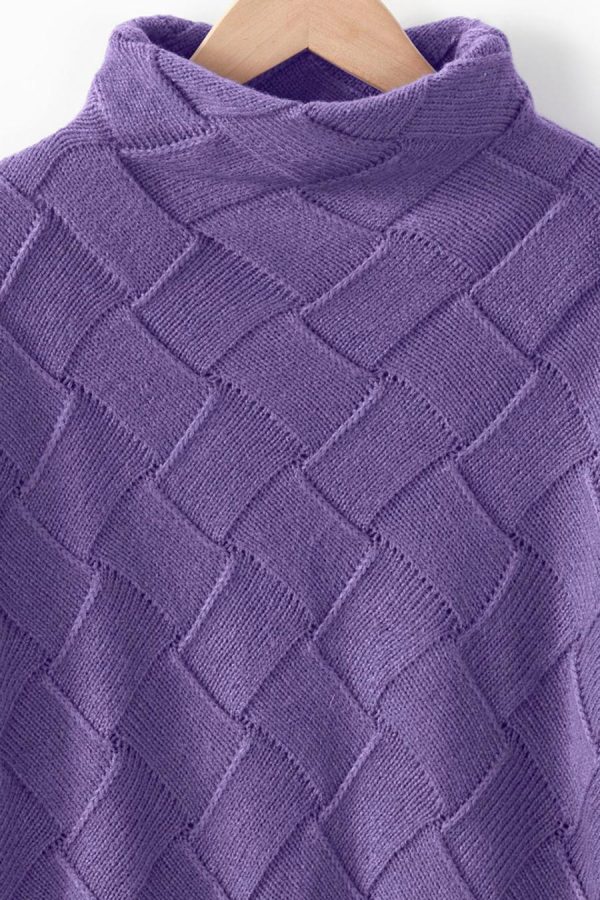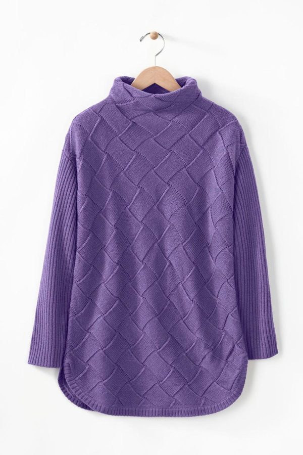 Wind your way anywhere in this soft, intriguing sweater, textured with a crisscross basketweave pattern and wide-ribbed sleeves. Funnelneck, dropped shoulders, curved hem.