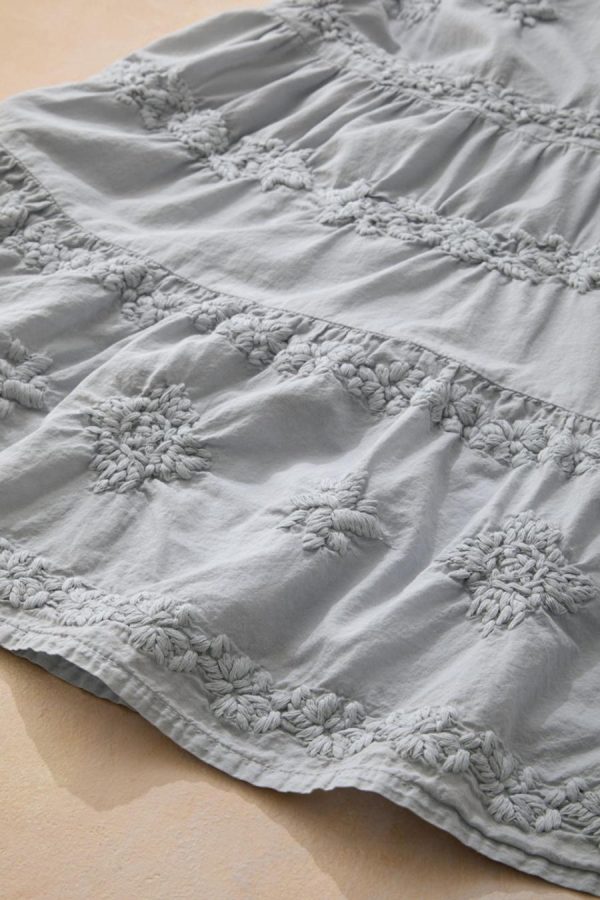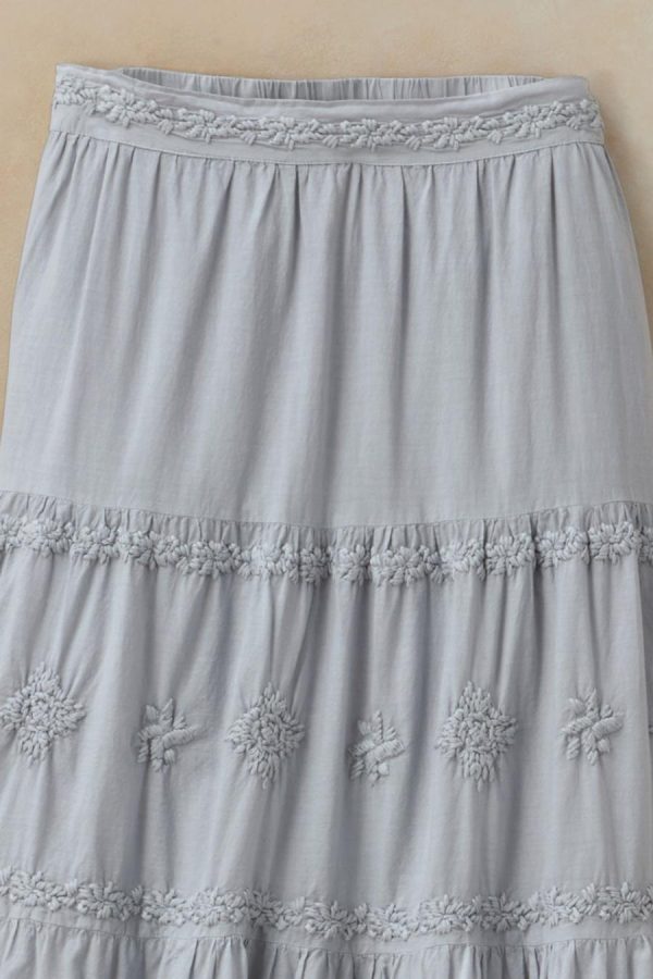 Discover the beauty of comfort in this tiered skirt – light and breezy for hot days, and delightfully embellished with tonal floral embroidery. Pull-on waist with flat front and back elastic. Fully lined. 150″ sweep.
