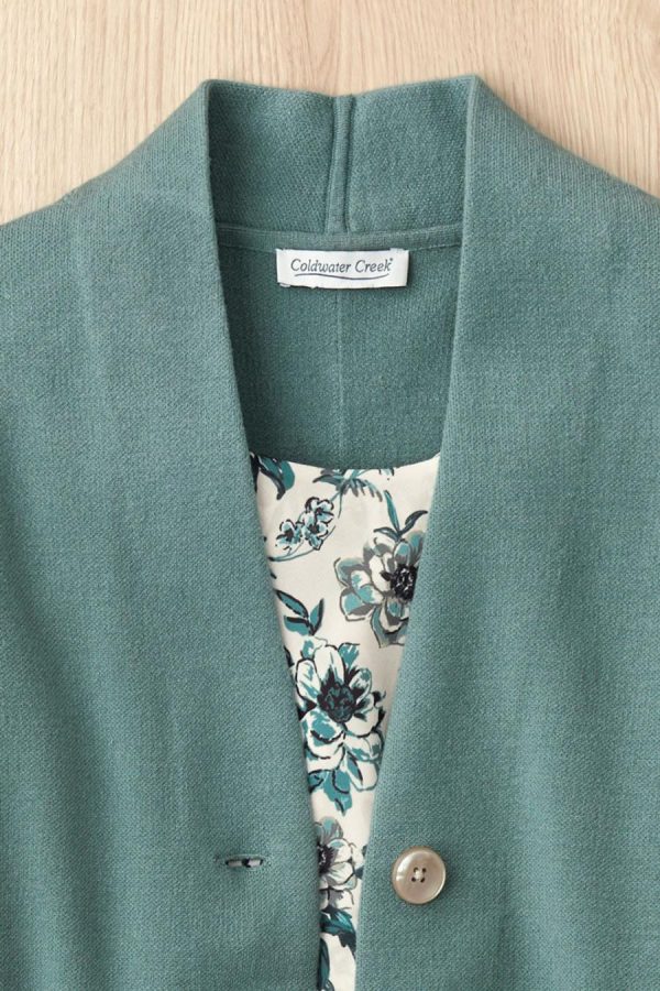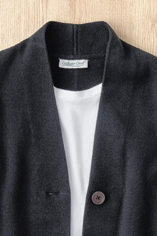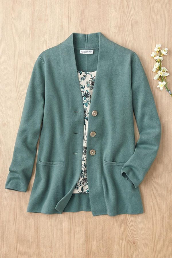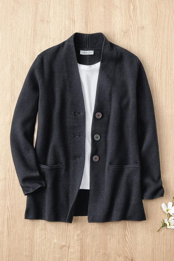 The perfect meeting of jacket and cardigan… softly structured yet relaxed, with fabulous versatility. Fine-gauge sweater knit offers comfortable stretch, with a 3-button front and shawl collar. Midweight with dropped shoulders, center back seam, welt pockets.