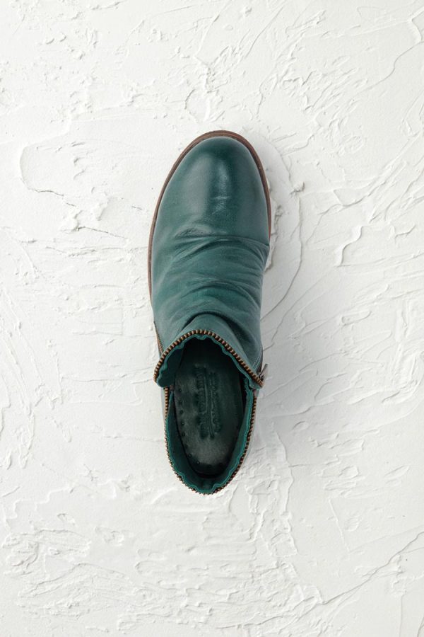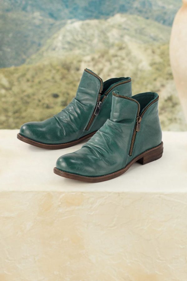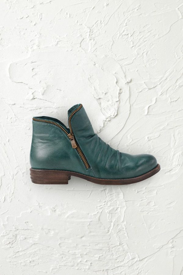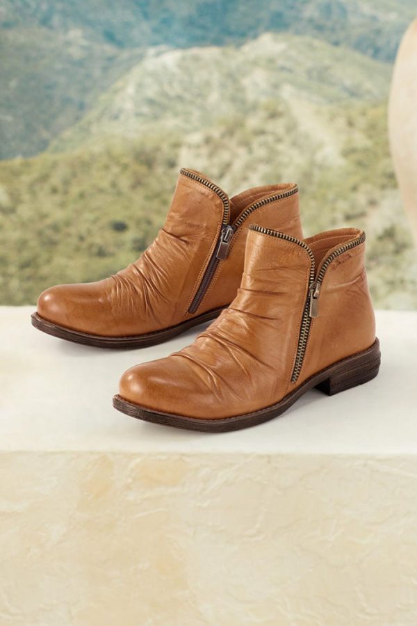 Soft, rich leather zip booties with ruched uppers that lend a casual feel. Inner zip closures and zip-trim detailing.