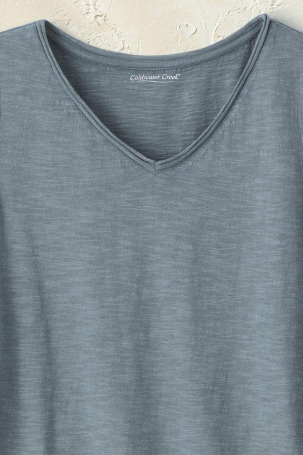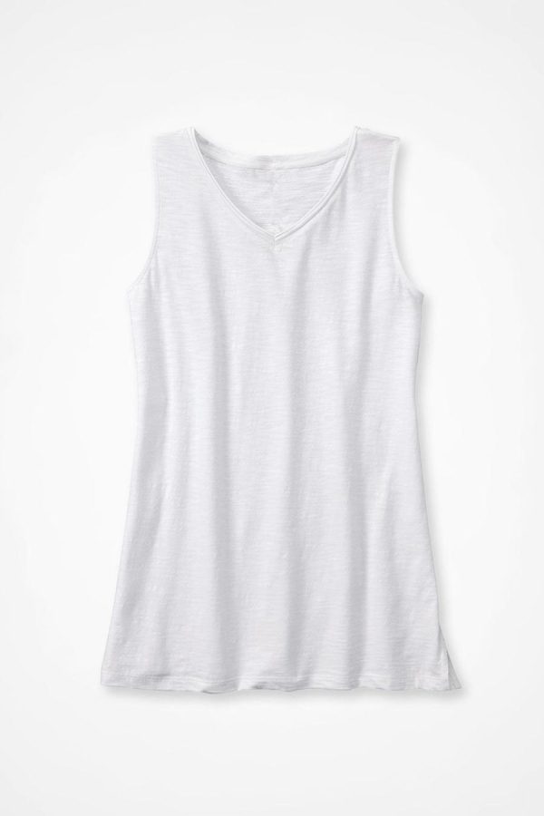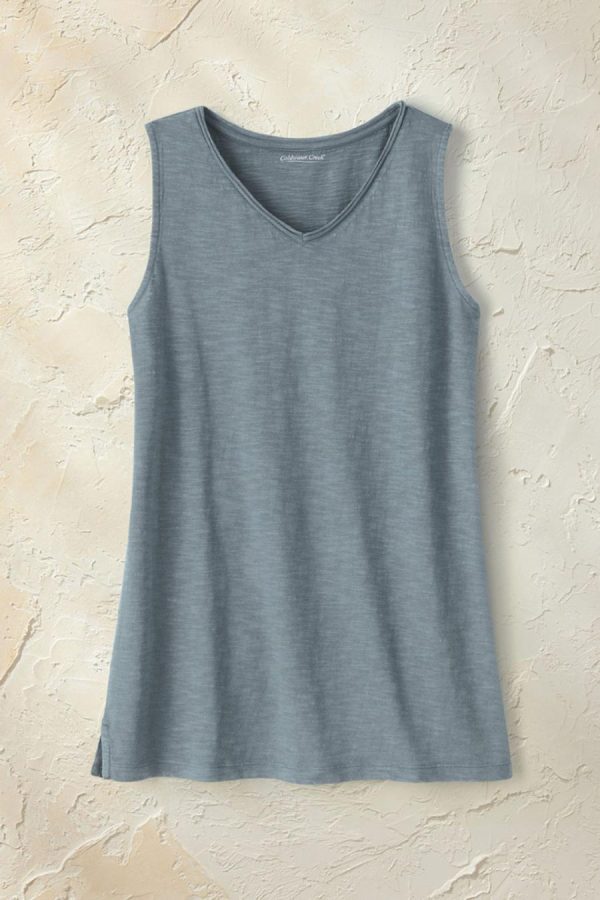 Our slub knit tank is incredibly soft and gently textured, in a great tunic length. Finished with raw-edge trim, straight hem and side slits.