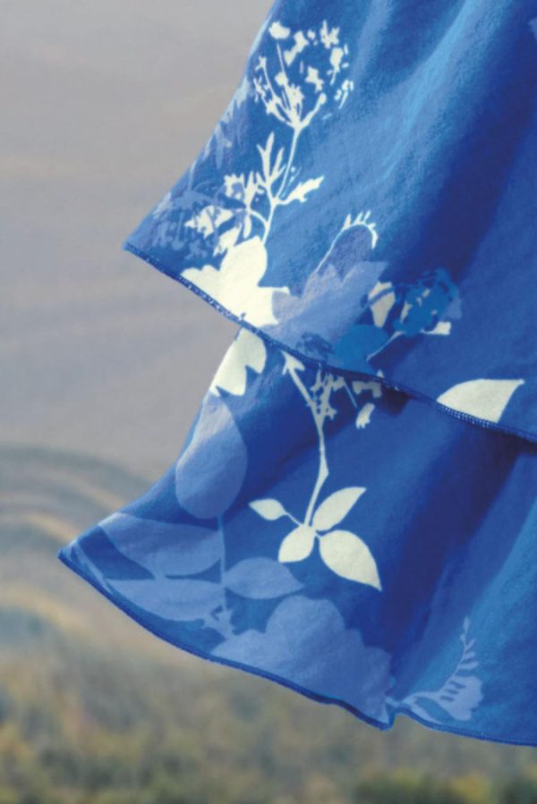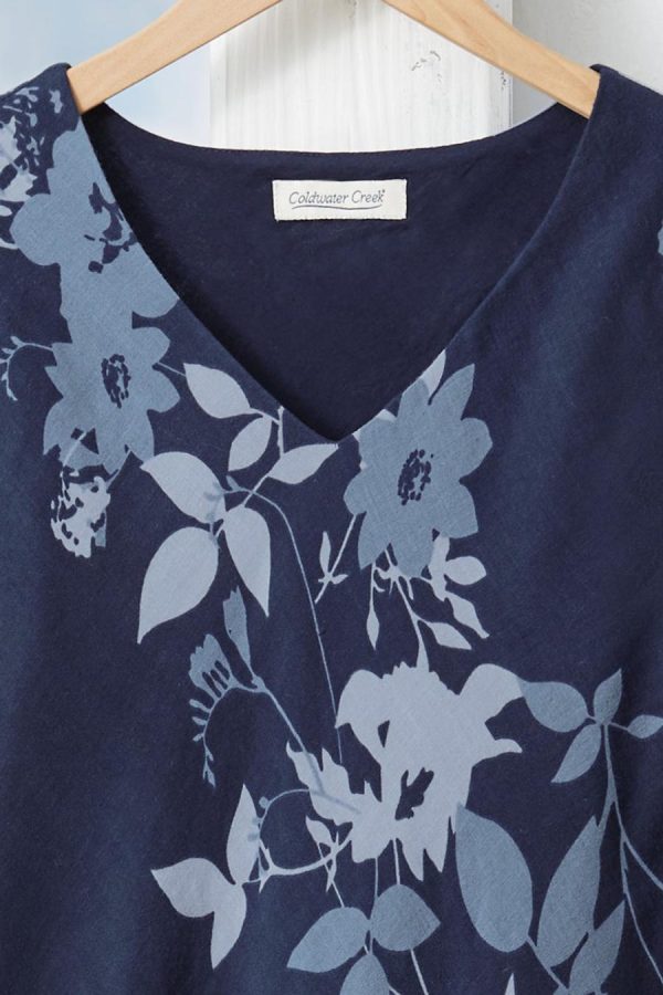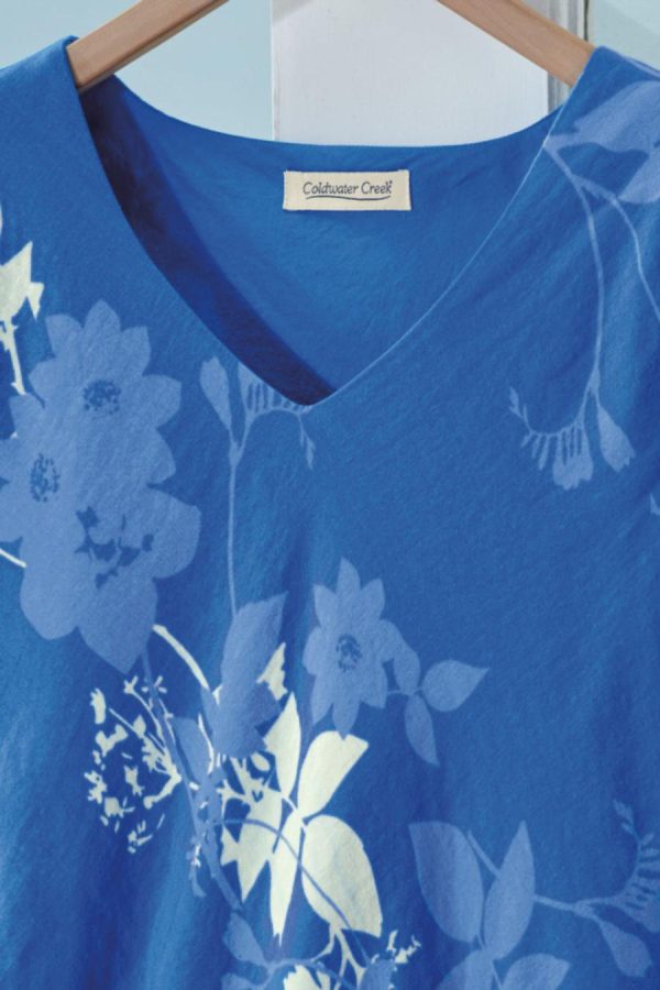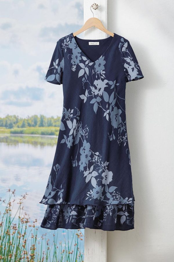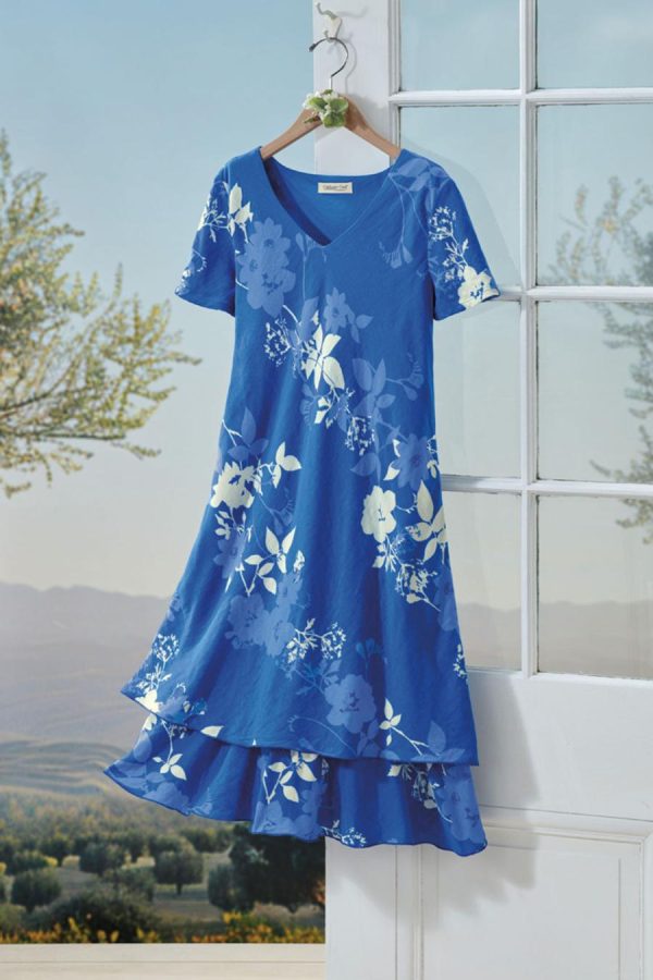 Summer-favorite cotton with a fresh look, in a flowing shades-of-blue floral print plus a tiered ruffle hem. Slipover style is cut on the bias, with short sleeves and a lined body.
