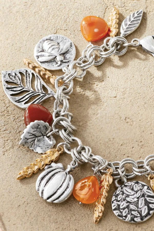 Etched botanicals, pumpkin and bee charms invoke the season, along with genuine agate stones for a pop of color.