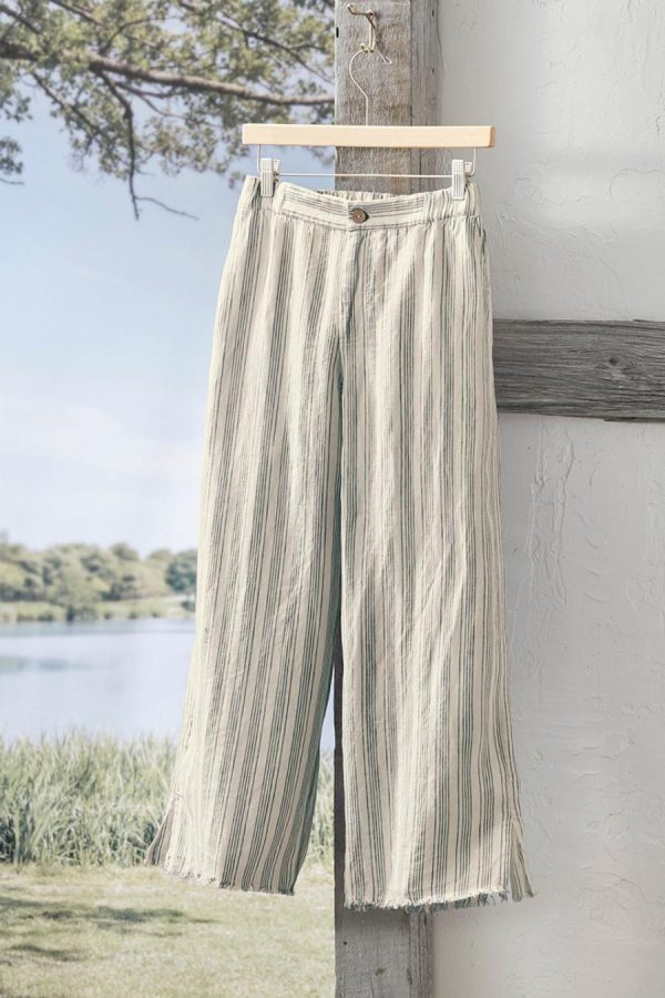 Yarn-dyed, European-grown linen gives these lightweight crops natural depth and drape – detailed with frayed, side-slit hems and a pattern of fresh-air stripes.