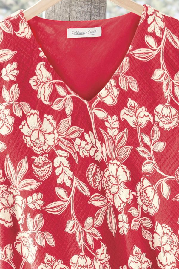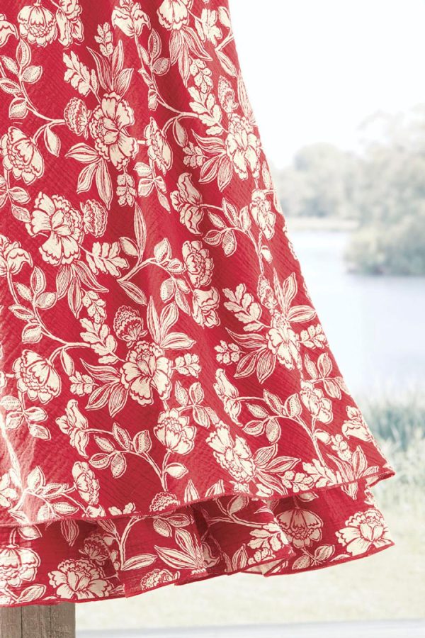 Summer-favorite gauze, all dressed up – with a Jacobean-inspired floral print and tiered ruffle hem. Slipover style is cut on the bias for a flattering fit, body lined.