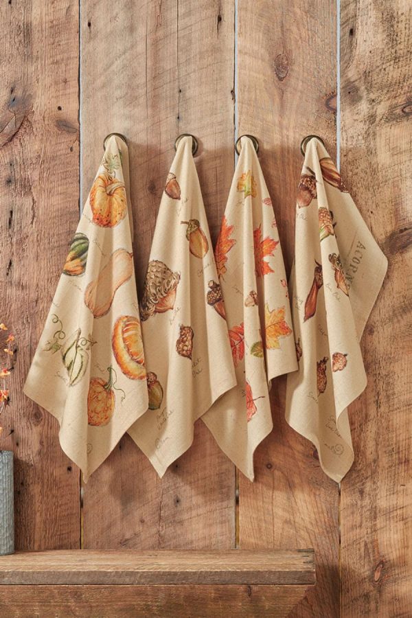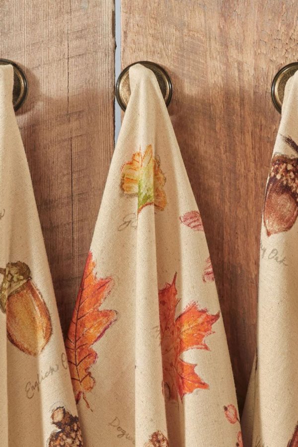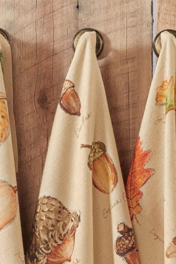 These harvest-themed kitchen towels are printed with colorful illustrations of leaves, gourds, pumpkins and acorns. Natural, lightweight and absorbent.