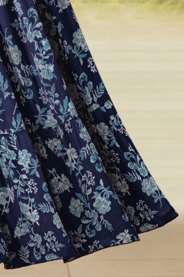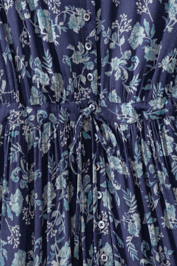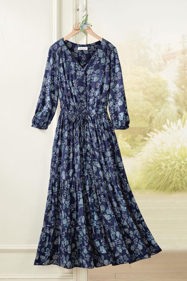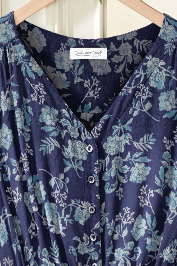 Sweeping tiers, softly woven in a shades-of-blue floral print. Our button-front dress has a gathered back yoke and shoulder seams, back elastic shaping, a tunnel drawstring waist and side-seam pockets. Unlined.