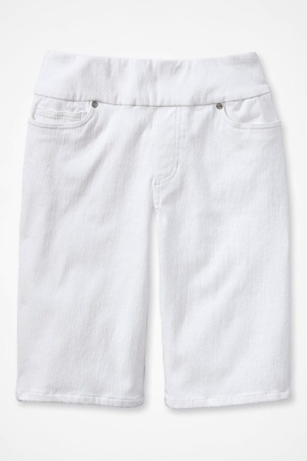 A favorite summer go-to, with comfortable jeans styling in our super-soft stretch knit denim. Comfortable pull-on waistband, five pockets. Hits just above the knee. Imported.