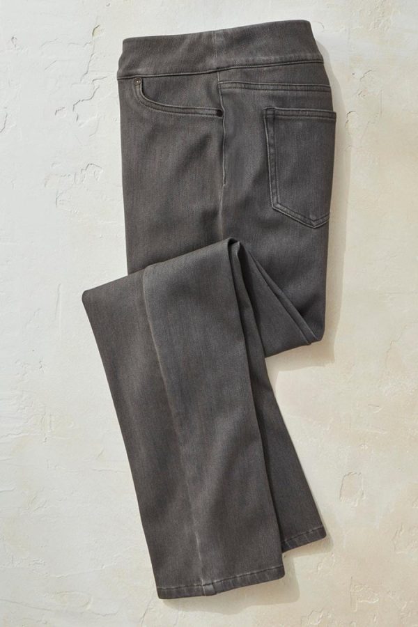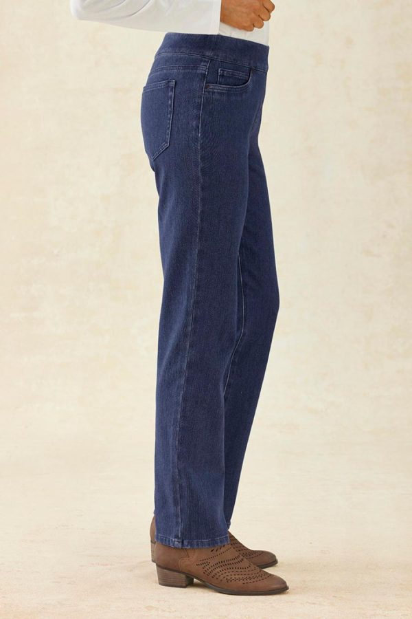 Knit denim pull-on jeans with our top-rated ShapeMe® technology offers the perfect combination of comfort and fit. We’ve enhanced your favorite style with our signature tummy-control panel, plus an updated waistband that’s softer with more stretch for all-day comfort. Front pockets, back patch pockets. Slim fit through hips and thighs. High rise sits at the waist, slim leg with 14″ opening.
