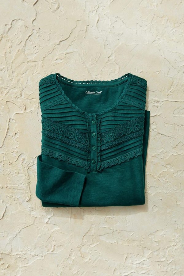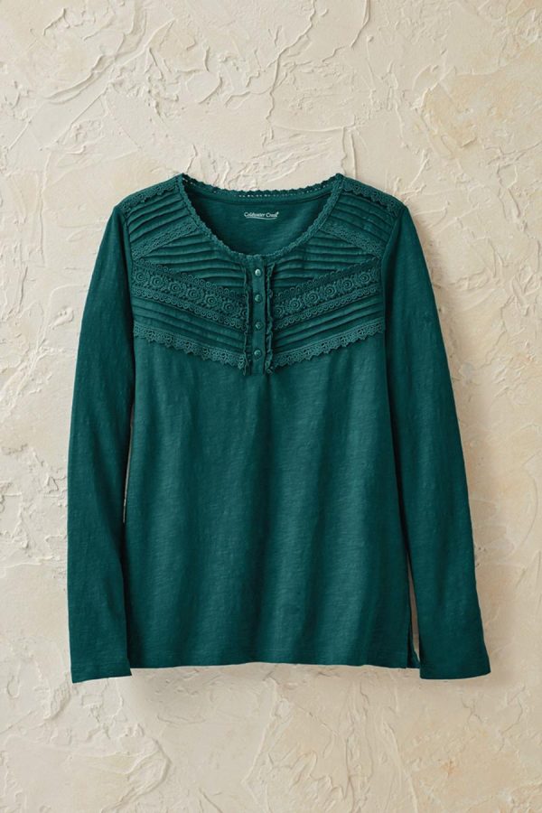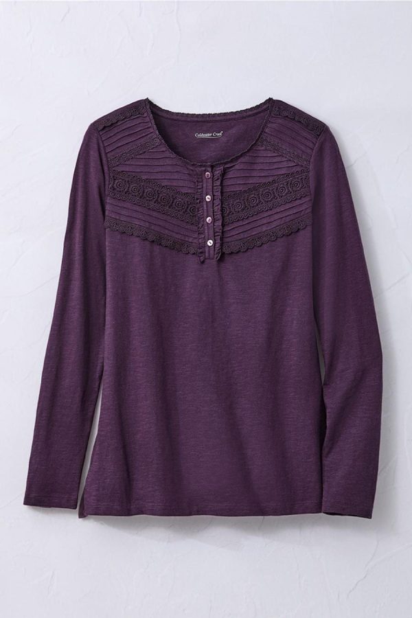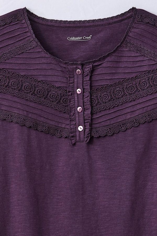 A charmed tee with subtle texture and special details. Lightweight Henley style is garment-dyed in a soft slub knit, with a front yoke of tucks and lace. Long sleeves, side slits.