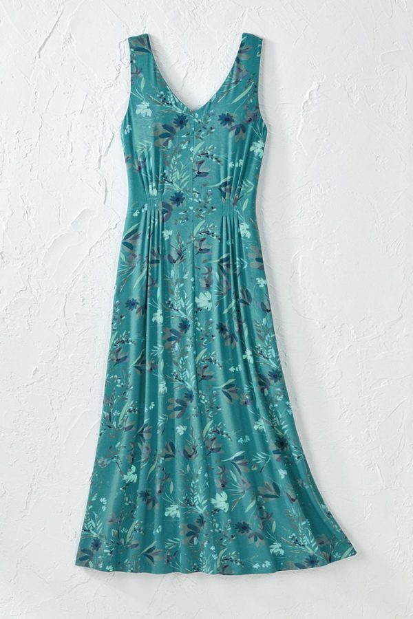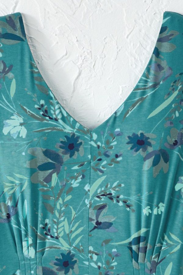 Soft colors invite the sun on our jersey knit maxi dress in a beautiful floral print. Shaping tucks at the sides of the front and back waist for graceful drape. Slipover style with V-neck, center seams on front and back, lined bodice.