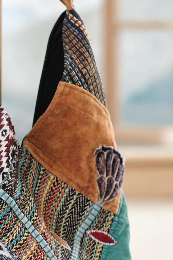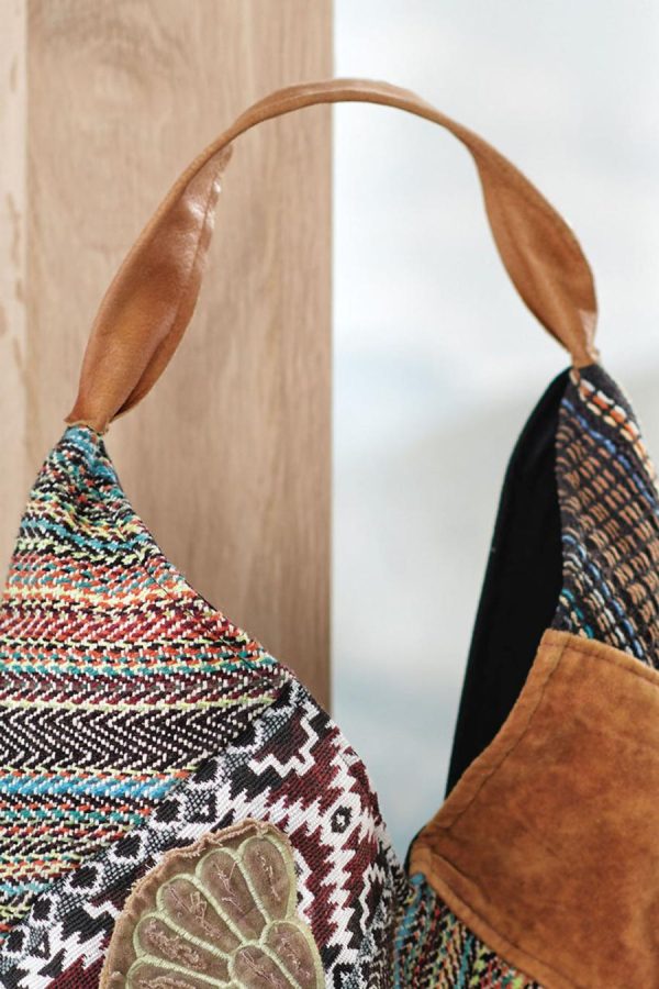 Wind your way through countless looks with this surprisingly versatile bag, handsewn and hand-embroidered with a patchwork of eclectic textiles. Roomy, lightweight vintage style with solid back and leather handle. Magnetic closure, two open pockets and one zip pocket.