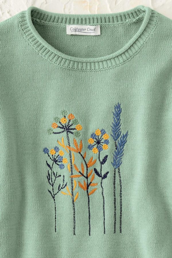 A delicate hue adds serenity to this soft-spun pullover, embroidered with sun-kissed wildflowers – a wearable ode to spring. Finished with rolled edges.
