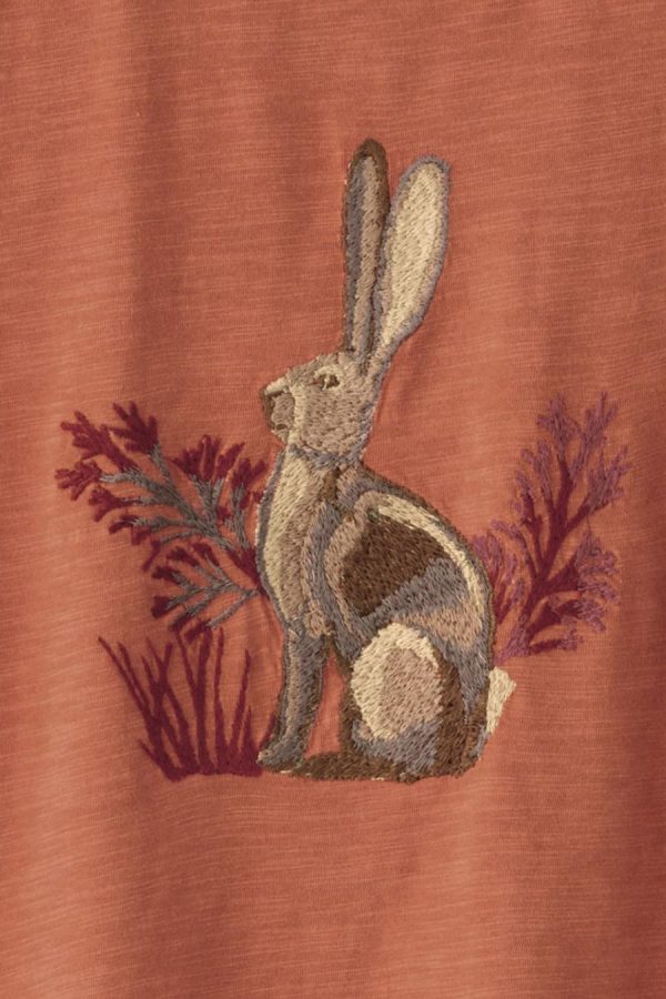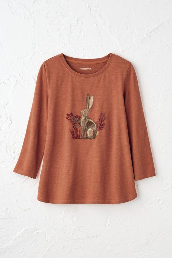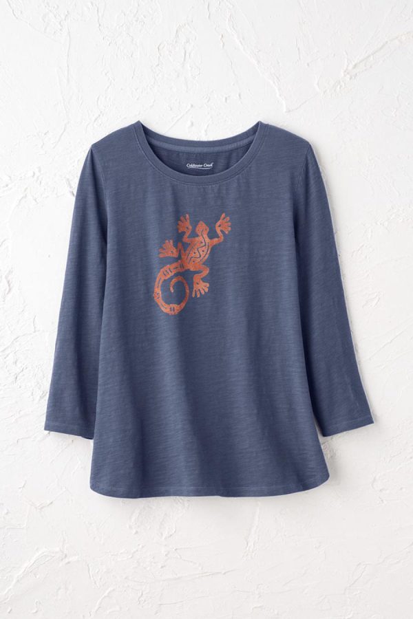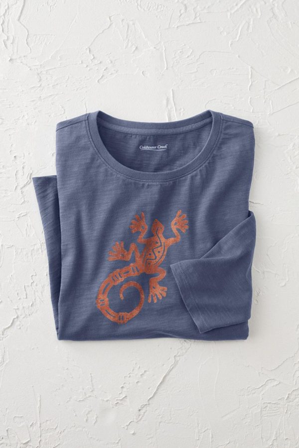 Graphic tees inspired by the desert Southwest offer comfortable style with artistic flair. Choose from wild horse or gecko prints, or an embroidered desert jackrabbit – all featured on our soft slub knit fabric. Features 3/4 sleeves and side-slit curved hem for a flattering look. Relaxed fit, hits mid hip.