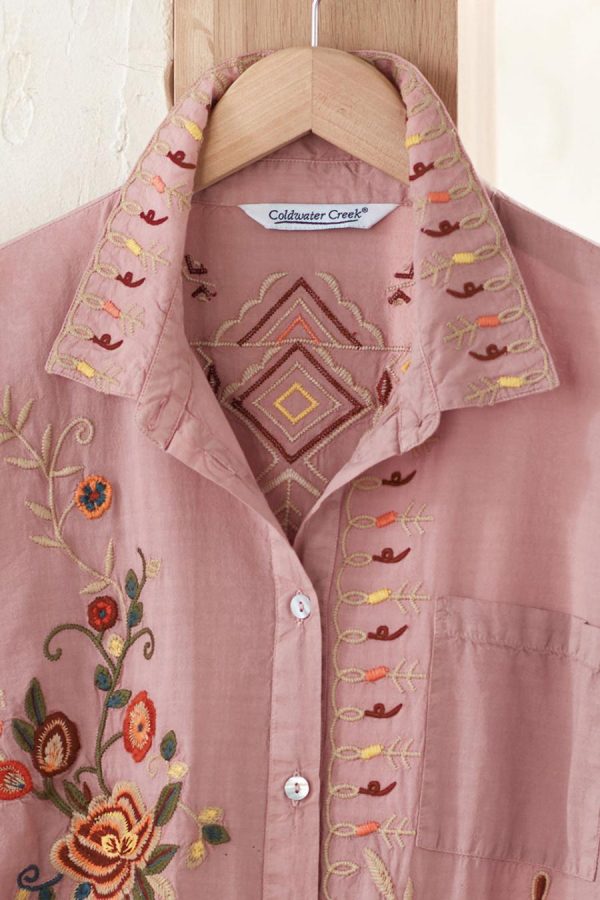 Embroidered cotton voile shirt captures sun-warmed days and desert dreams with beautiful roses and Southwest-inspired motifs. This artisanal shirt is naturally breathable in ultra-light cotton voile. Features single patch pocket and dropped shoulder 3/4 sleeves you can roll for a casual look. Elliptical hem is slightly lower in back. Boxy fit, hits mid hip.