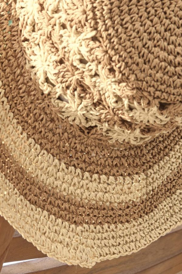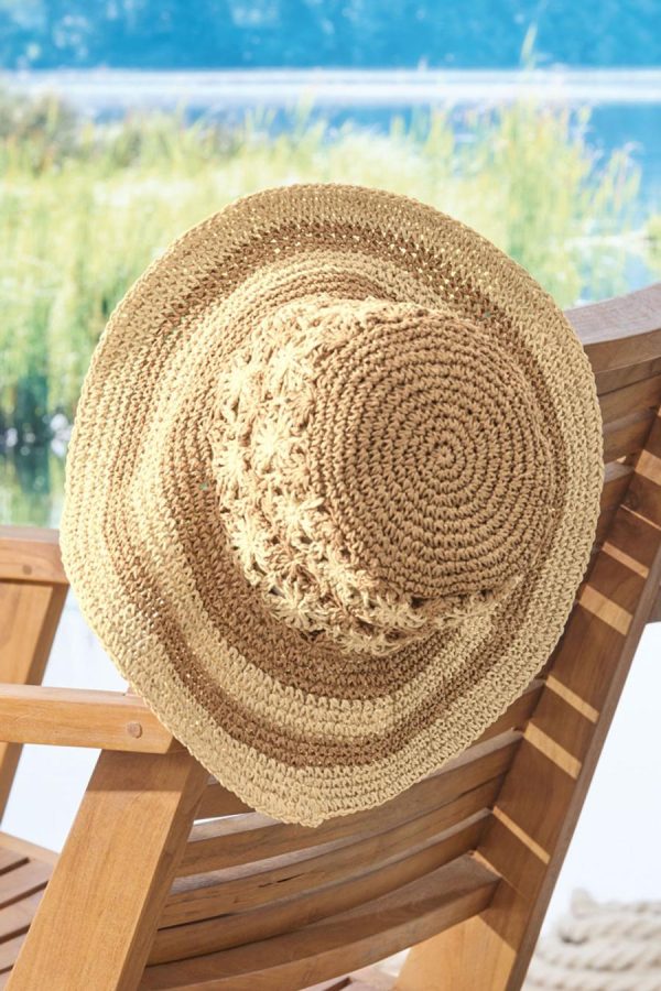 Feels like vacation, wherever you wear it. Lightweight and packable, this crochet sunhat features two-tone stripes and a fun floral motif on the crown.