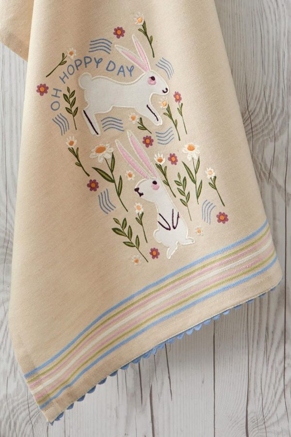 The promise of spring, captured with appliqué and embroidery on these lightweight, durable towels – one with garden bunnies and the other with a floral egg, both with ruffled edges. Makes a great hostess gift.