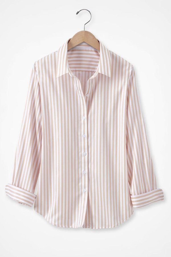 A clean-lined look in our essential, wrinkle-free no-iron striped shirt. Horizontal stripes add contrast on the back yoke, with reinforced front placket and curved hem.