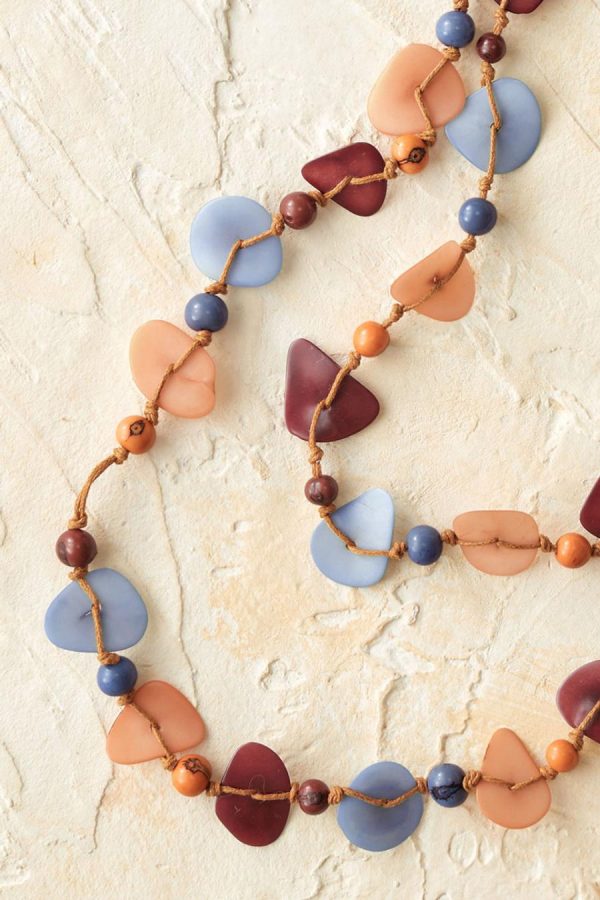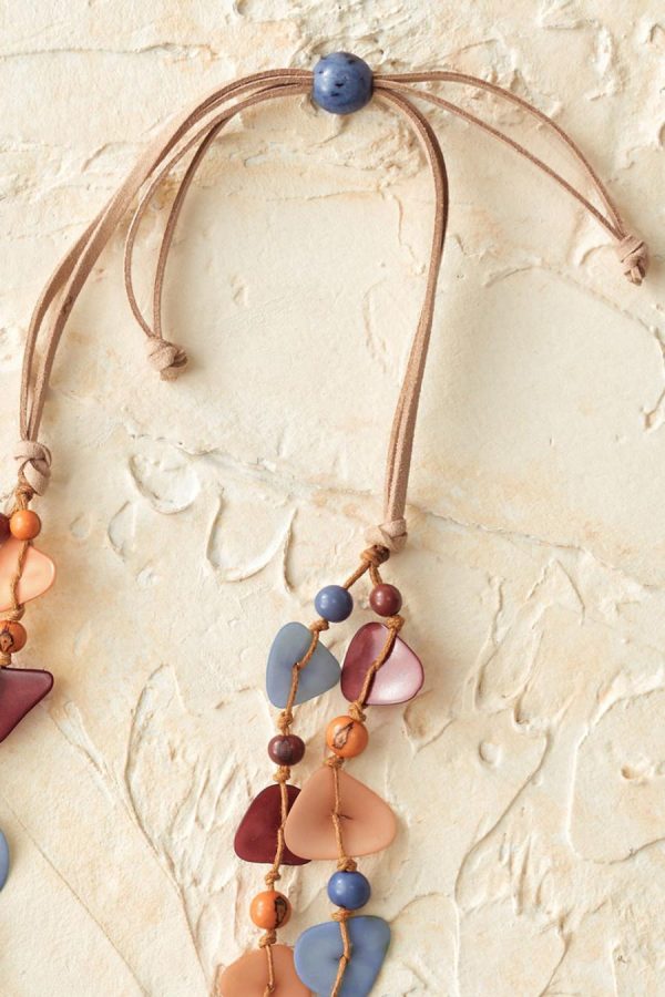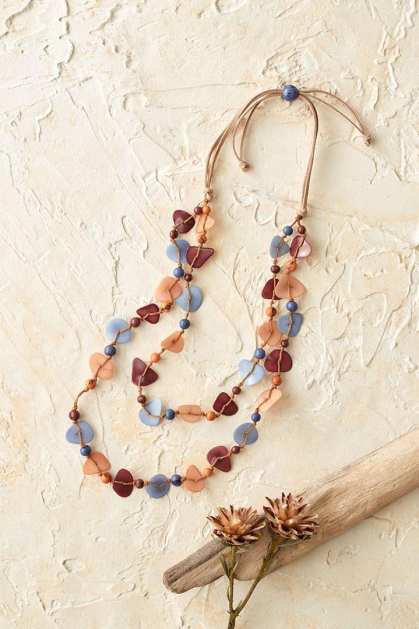 Unique, eco-friendly necklace is crafted with one-of-a-kind artistry featuring twin strands of multi-hued beads. Handmade by skilled artisans in Ecuador using tagua nuts and açai berries, colored with organic vegetable dyes.