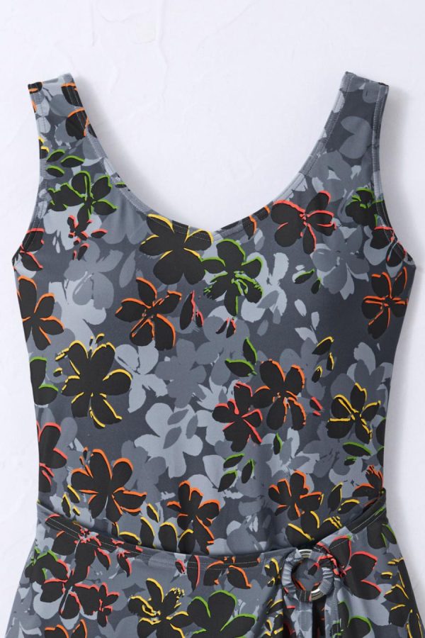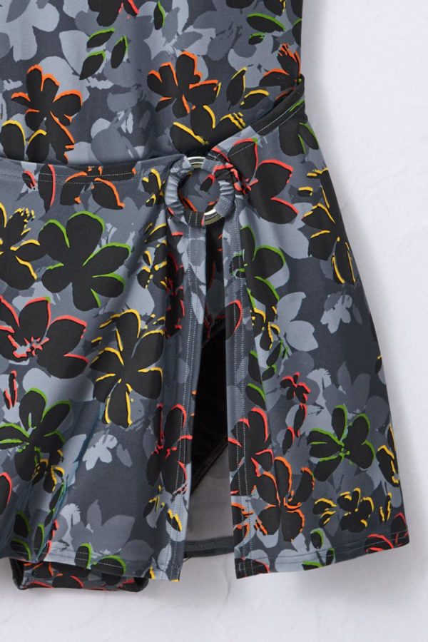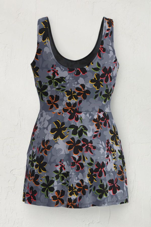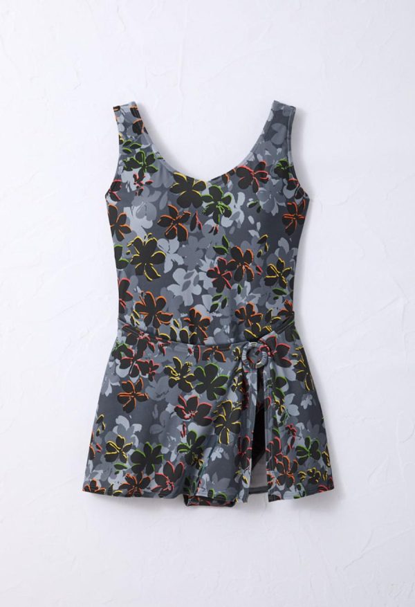 Fun pops of color trace shadowed florals, on our tank suit with an attached sarong for added coverage. Our inner power mesh ShapeMe panel provides extra smoothing, and silicone grip dots keep the leg openings in place. Deep-V back. UPF 30 for UV protection, chlorine resistant.