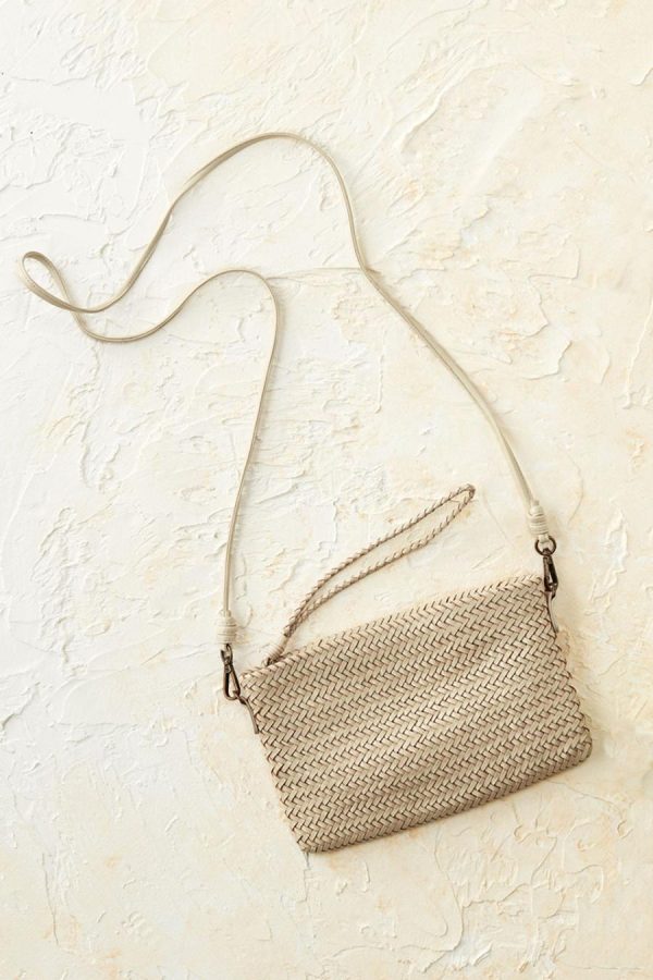 Handwoven leather gives this bag a wonderful zigzag texture, in a versatile size that works as a wristlet or crossbody style. Handcrafted.