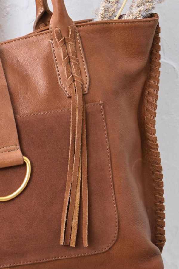 This handcrafted leather tote combines supple premium leather with rich suede front pocket detailing for distinctive style. Artisan-made with signature tassel and whipstitch details, the generously proportioned bag offers exceptional organization with top zip closure, multiple exterior pockets, and three interior compartments. The spacious design transitions beautifully from work to weekend. 100% cotton lining. About 12″ x 18″ x 3″, with comfortable 10″ strap drop.